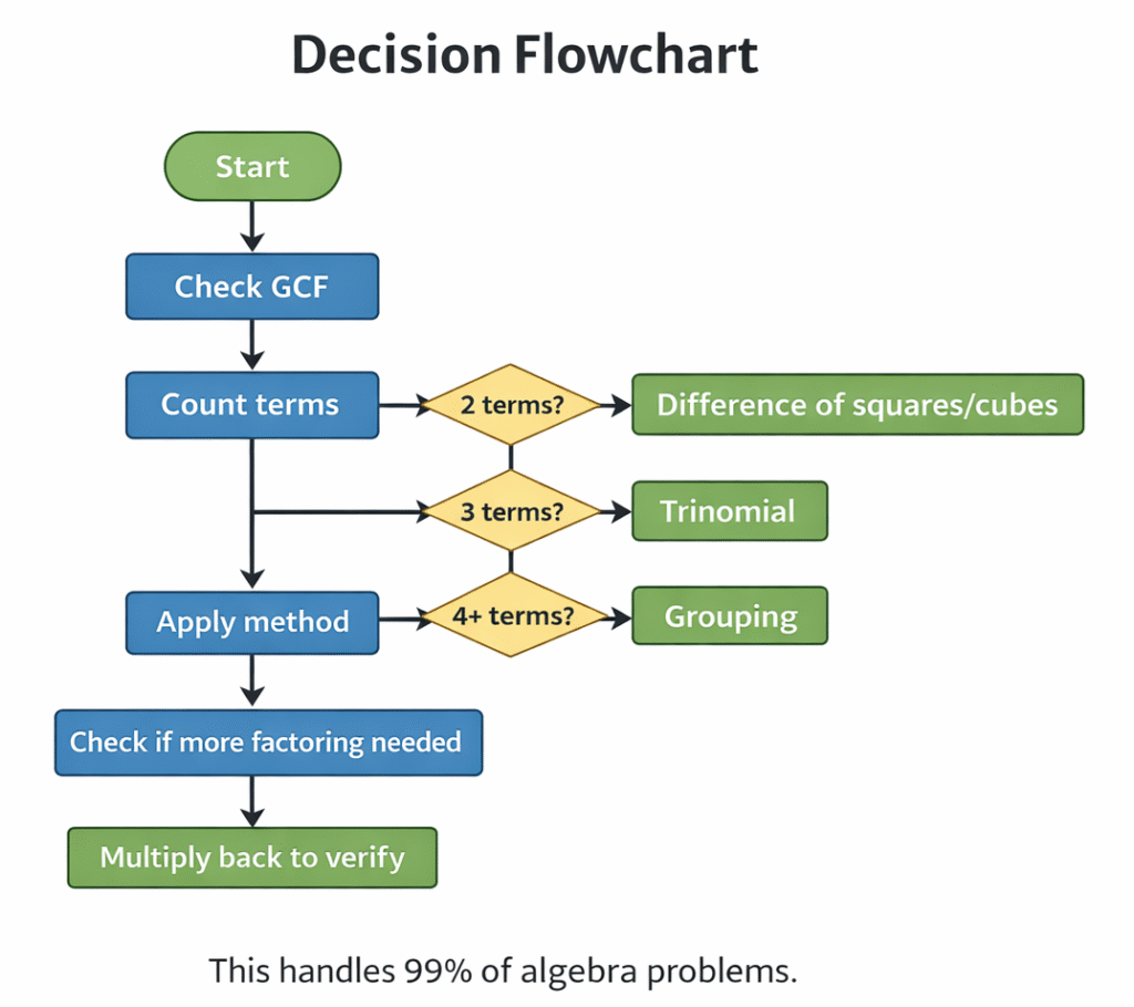 With practice, pattern recognition becomes automatic. You’ll see a polynomial and immediately know which method to use.